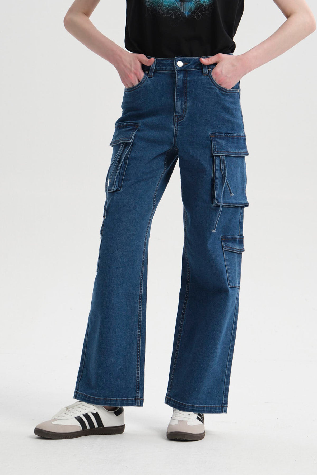 Jeans Mujer Cargo Calce Recto Azul Oscuro