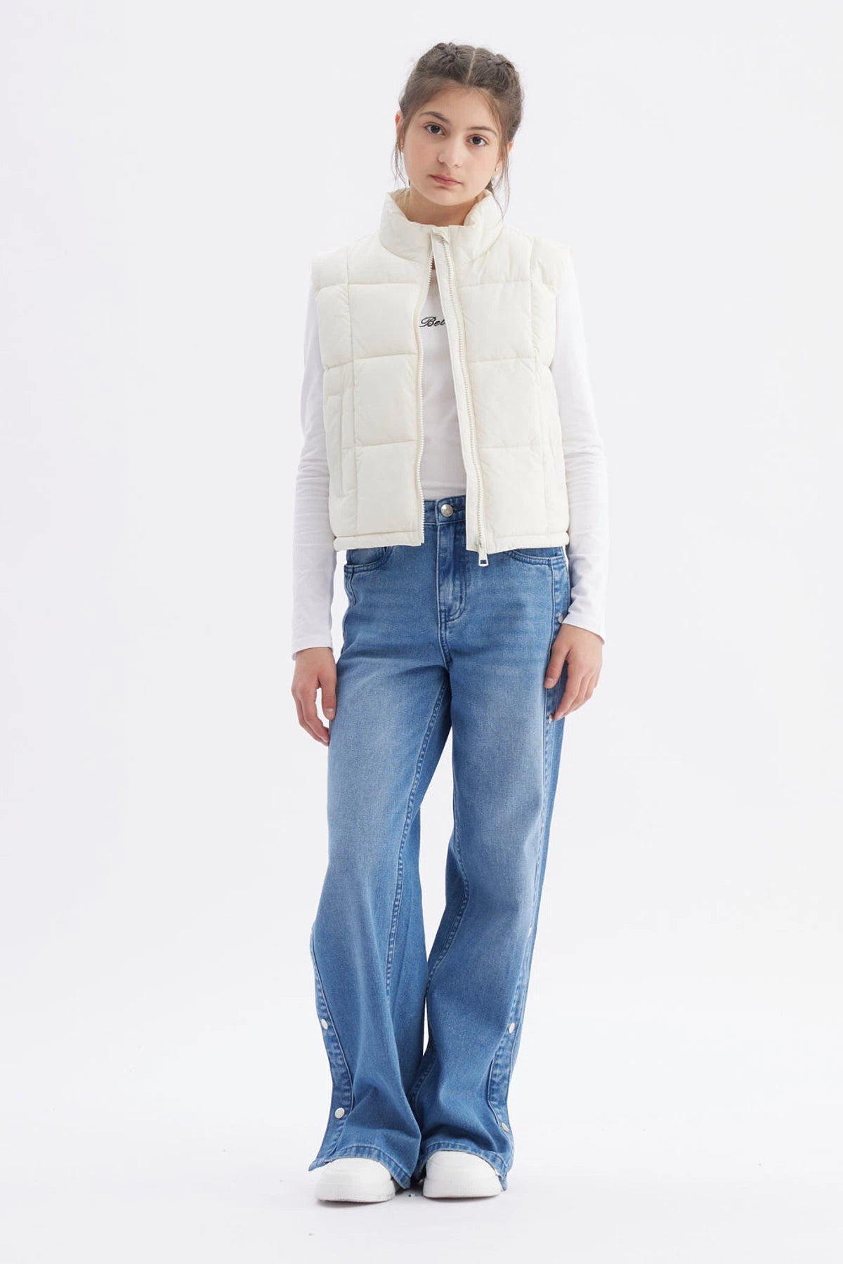 Chaleco acolchado crudo para niña con cuello alto y cierre frontal liso ideal para el invierno