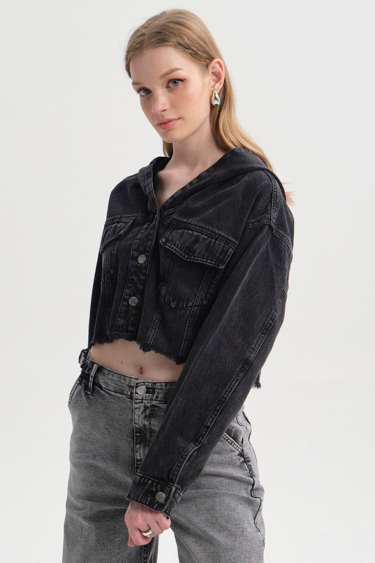 Esta chaqueta corta negra para mujer presenta un diseño liso y un corte moderno que resalta cualquier atuendo. Hecha de un tejido con alto porcentaje de algodón, su textura es suave y cómoda. La chaqueta cuenta con botones metálicos y un acabado deshilachado en el borde inferior, dándole un toque audaz. Ideal para salir con amigas a una tarde de café o para darle un giro a tu look casual de fin de semana. Combínala con jeans de tiro alto y botines para un estilo urbano auténtico.