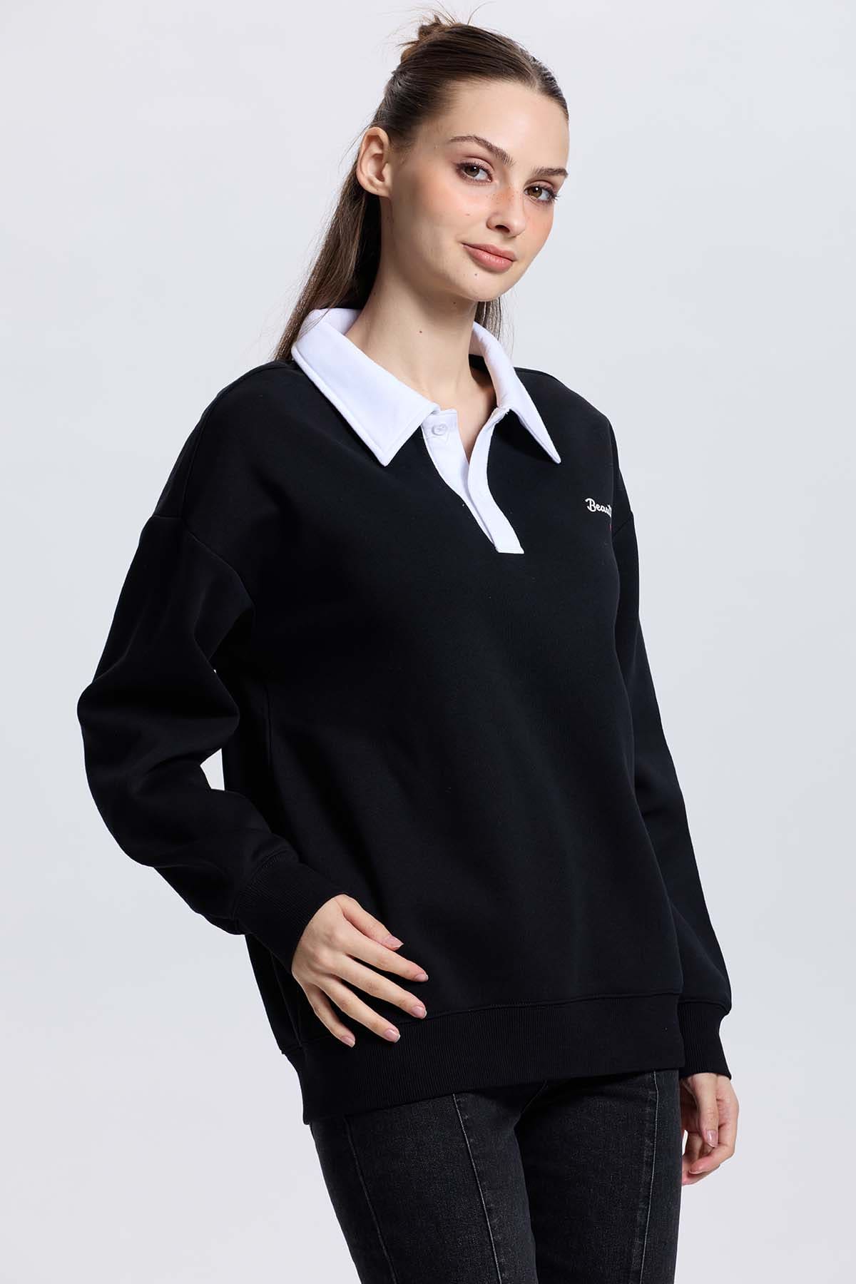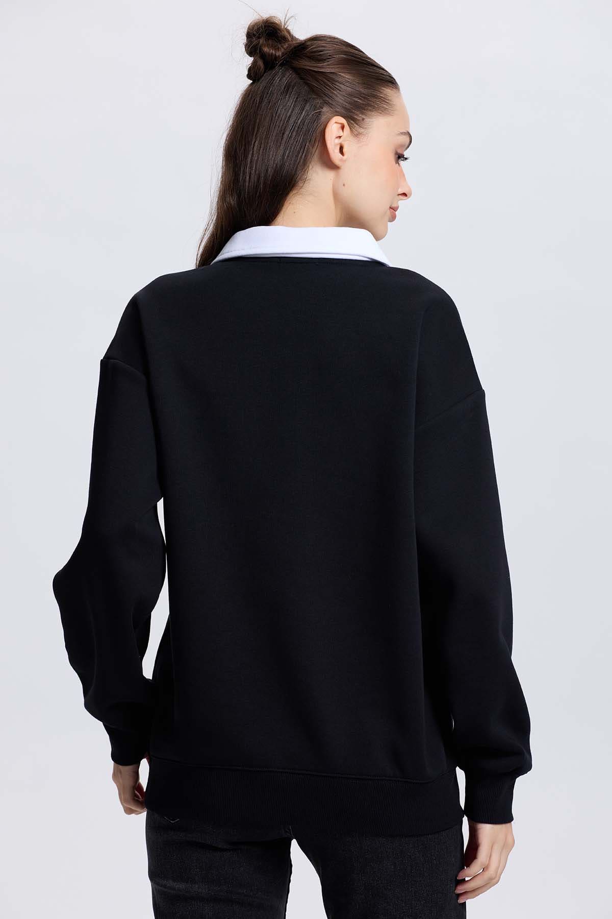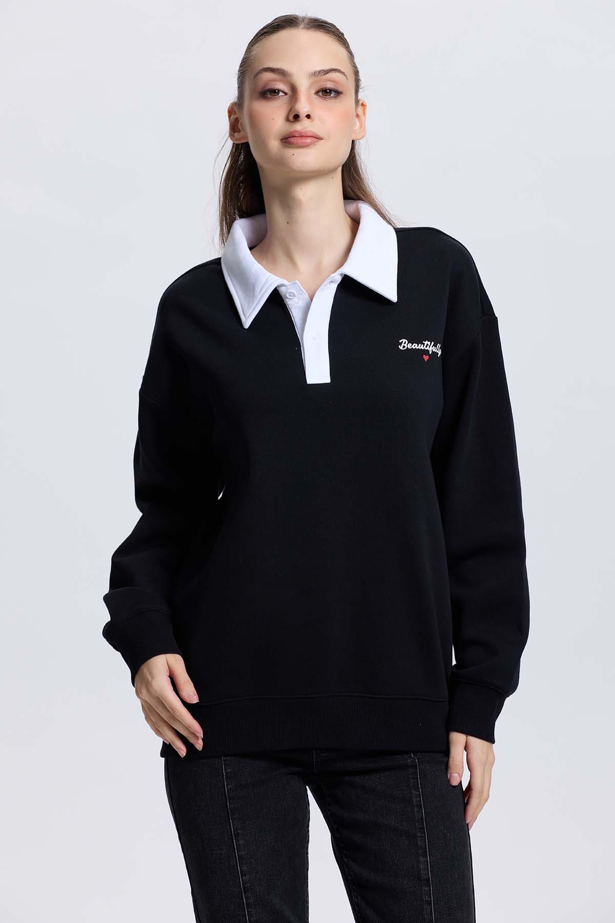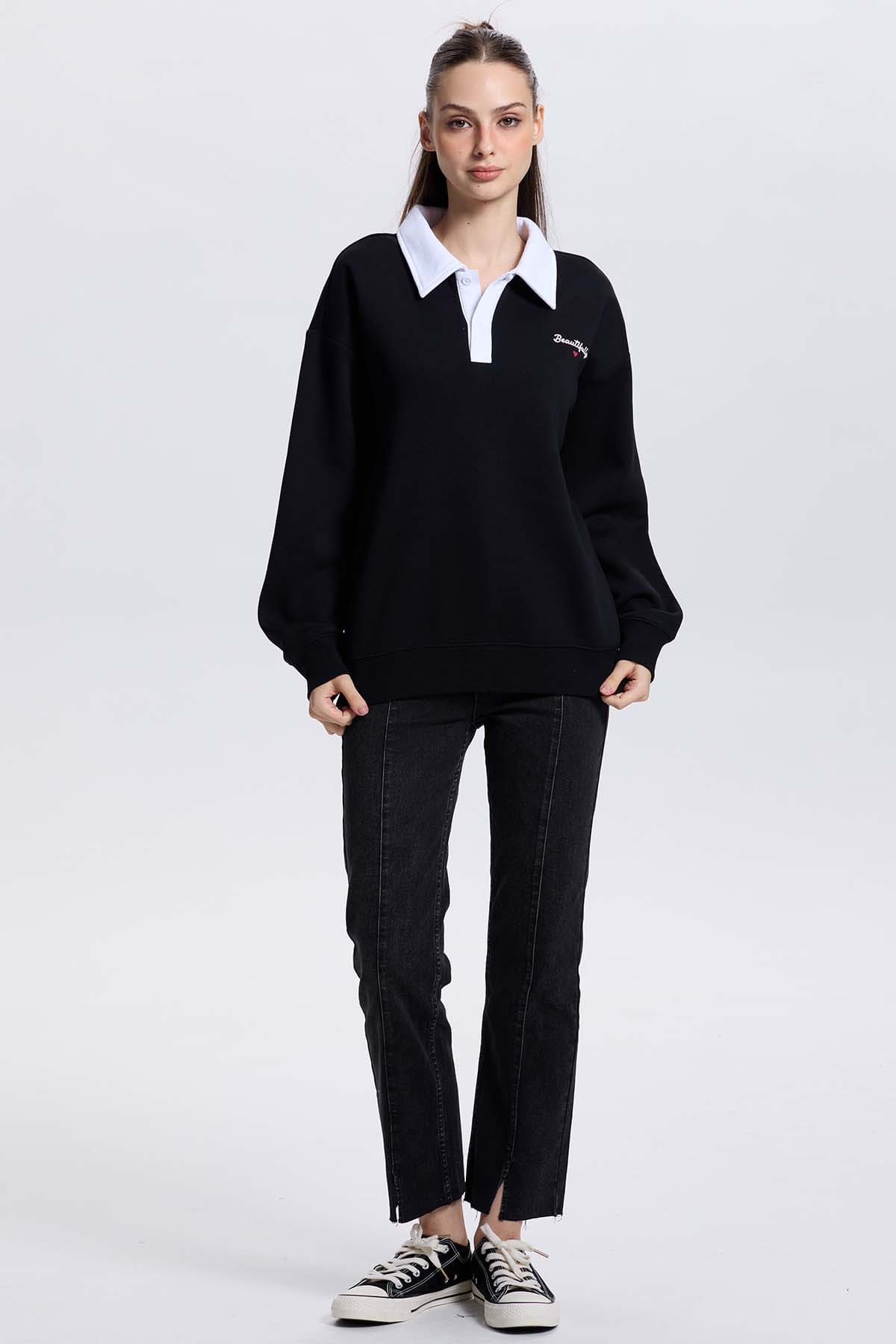 Polerón mujer negro de franela cardada, ideal para primavera-verano. Su tejido suave y abrigador ofrece confort, mientras el diseño con cuello polo blanco y detalle bordado le da un toque chic. Perfecto para una salida casual o una tarde relajada. Combínalo con jeans o faldas para un look desenfadado y moderno.