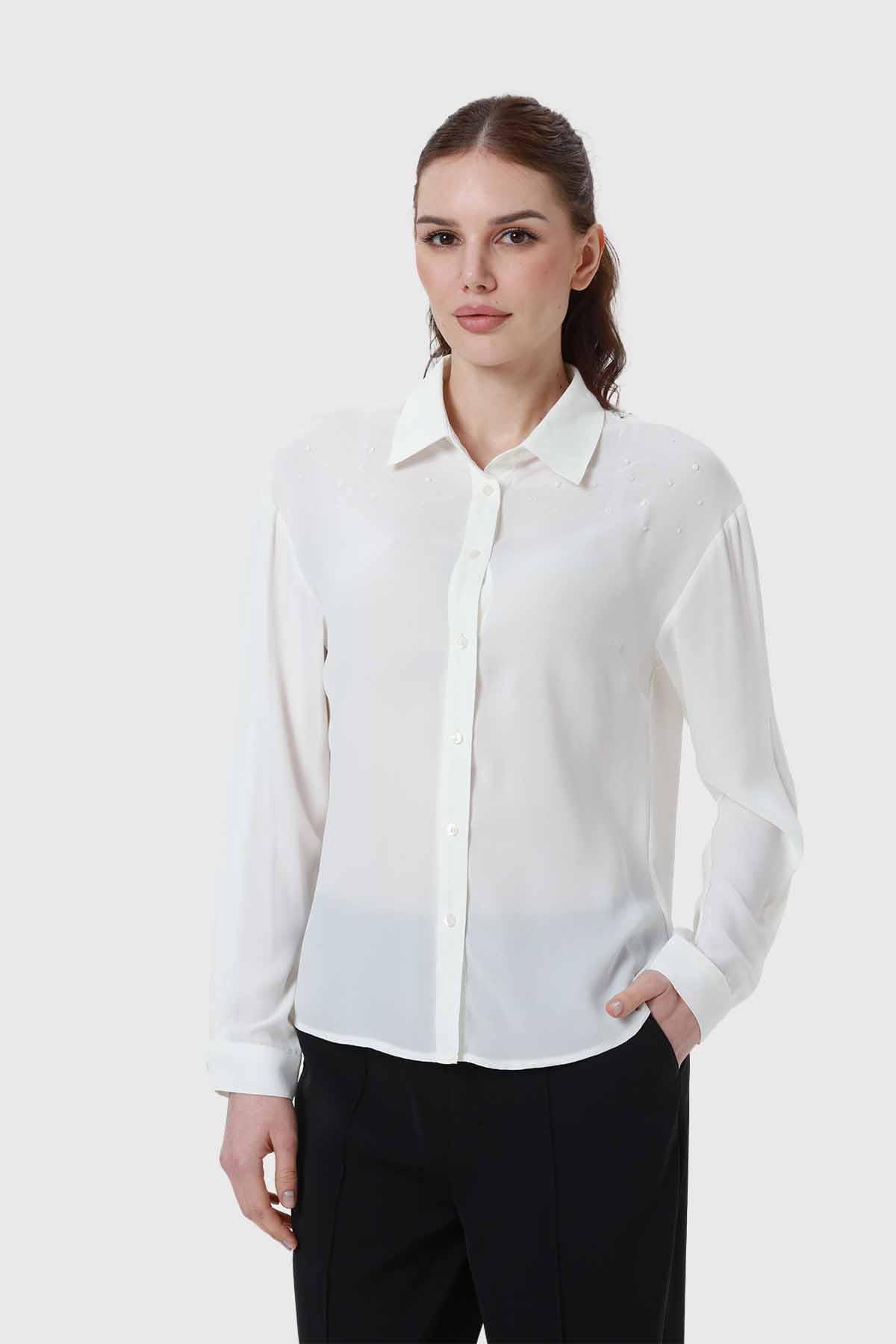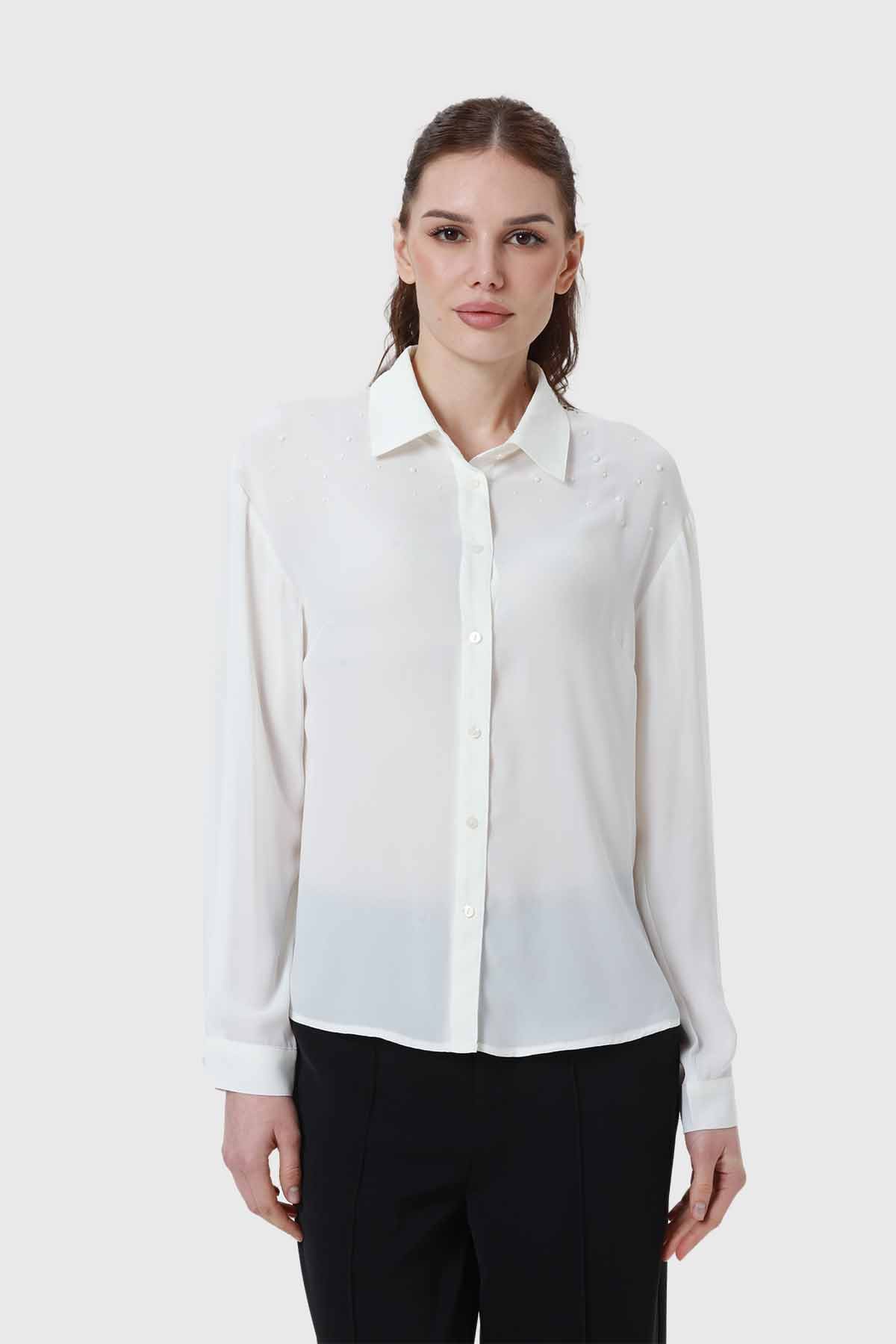 Blusa Mujer Aplicación Perlas Canes Crudo