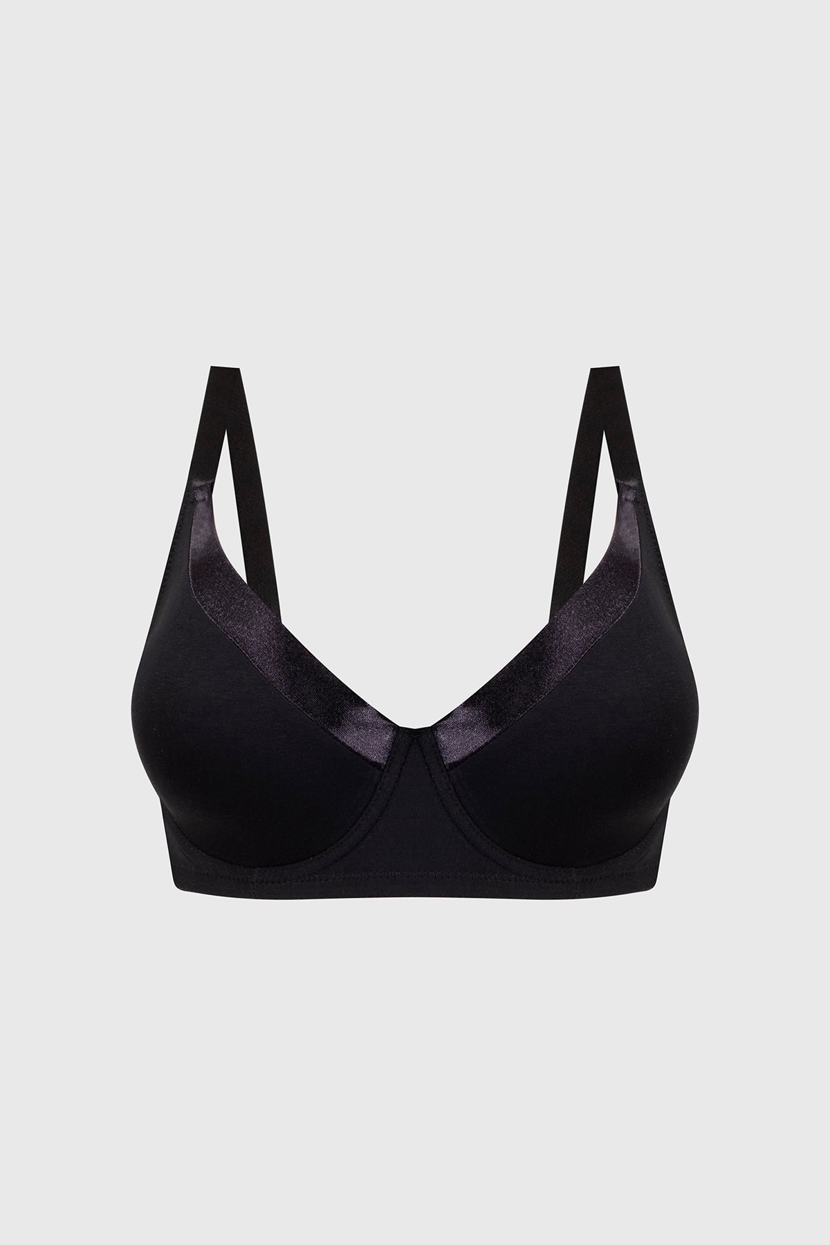 Este sostén negro para mujer ofrece un diseño liso con una textura suave y confortable gracias a su composición de 95% algodón. El ajuste es firme y cómodo, ideal para un uso diario prolongado. Perfecto para esos días de trabajo en la oficina donde la comodidad es clave. Combínalo con una blusa blanca para un look clásico y sofisticado.
