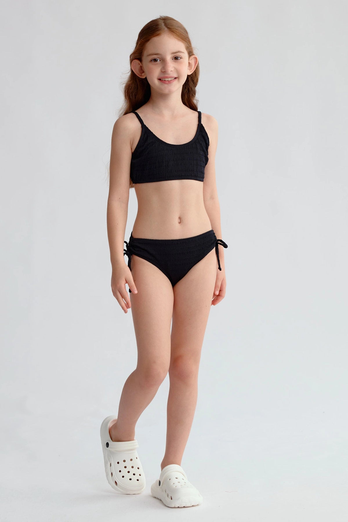 Este bikini negro para niña destaca por su textura suave y diseño liso, ofreciendo comodidad y estilo para los días de piscina. Sus tirantes ajustables y la cintura elástica aseguran un calce perfecto. Ideal para una tarde de juegos acuáticos o una visita a la playa. Combínalo con un sombrero de ala ancha y sandalias para un look veraniego completo.
