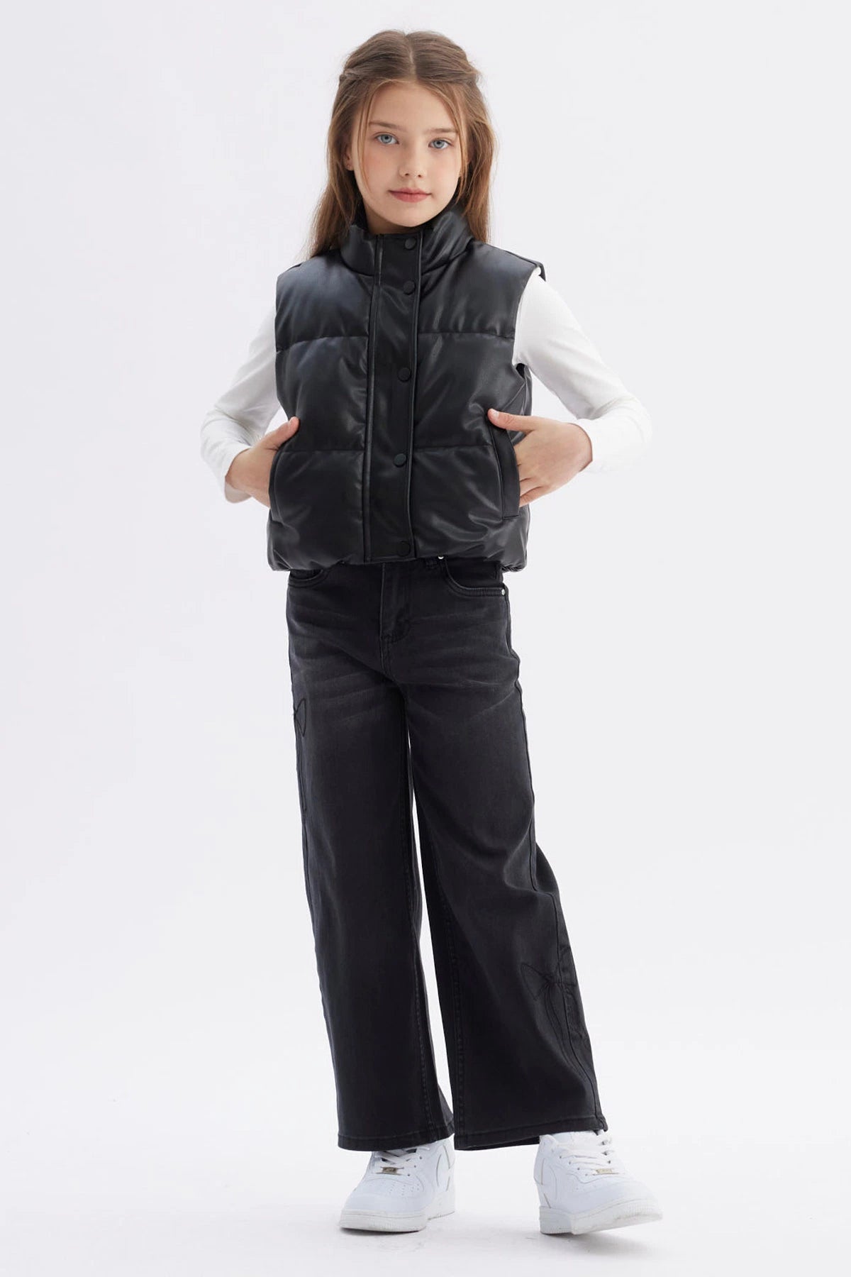 Chaleco sin mangas efecto cuero negro para niña diseño acolchado sin estampa con botones en la parte frontal