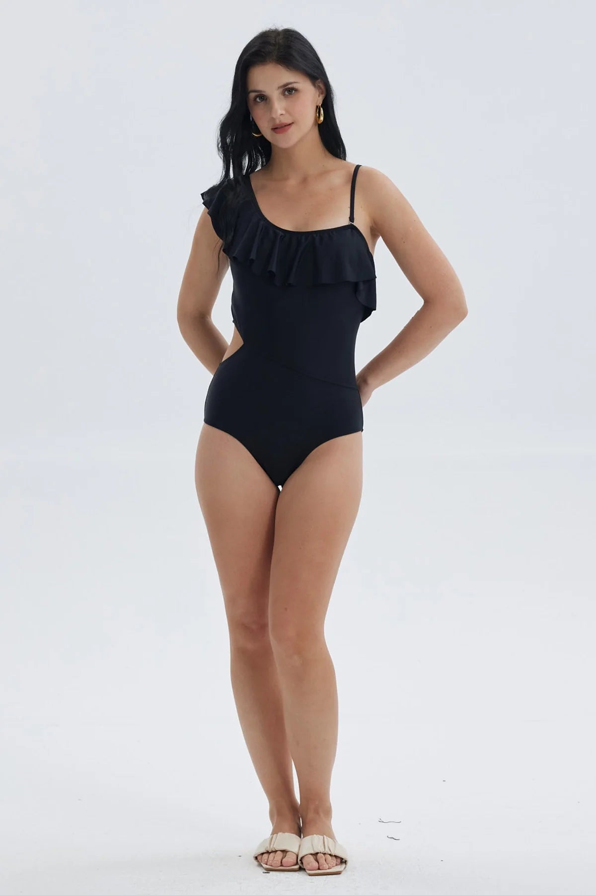 Traje de baño mujer entero negro con vuelo y tirantes finos