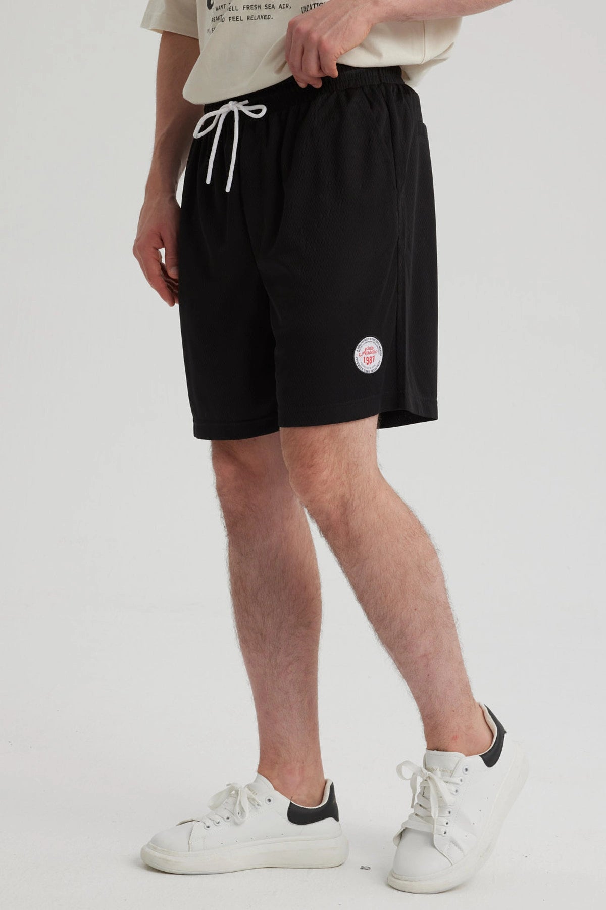 • Bermuda negra para niño con estampado blanco y detalles de cordón