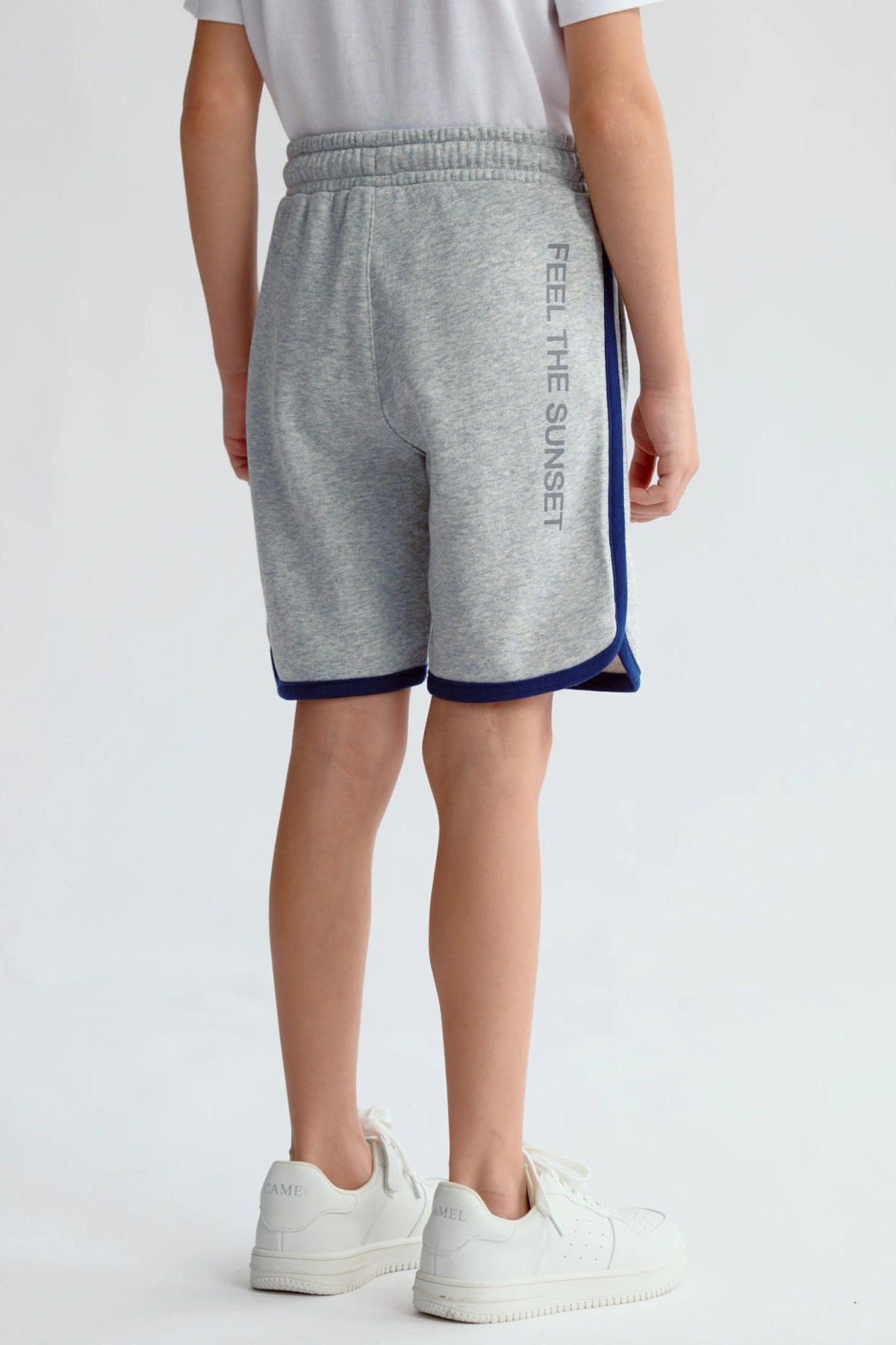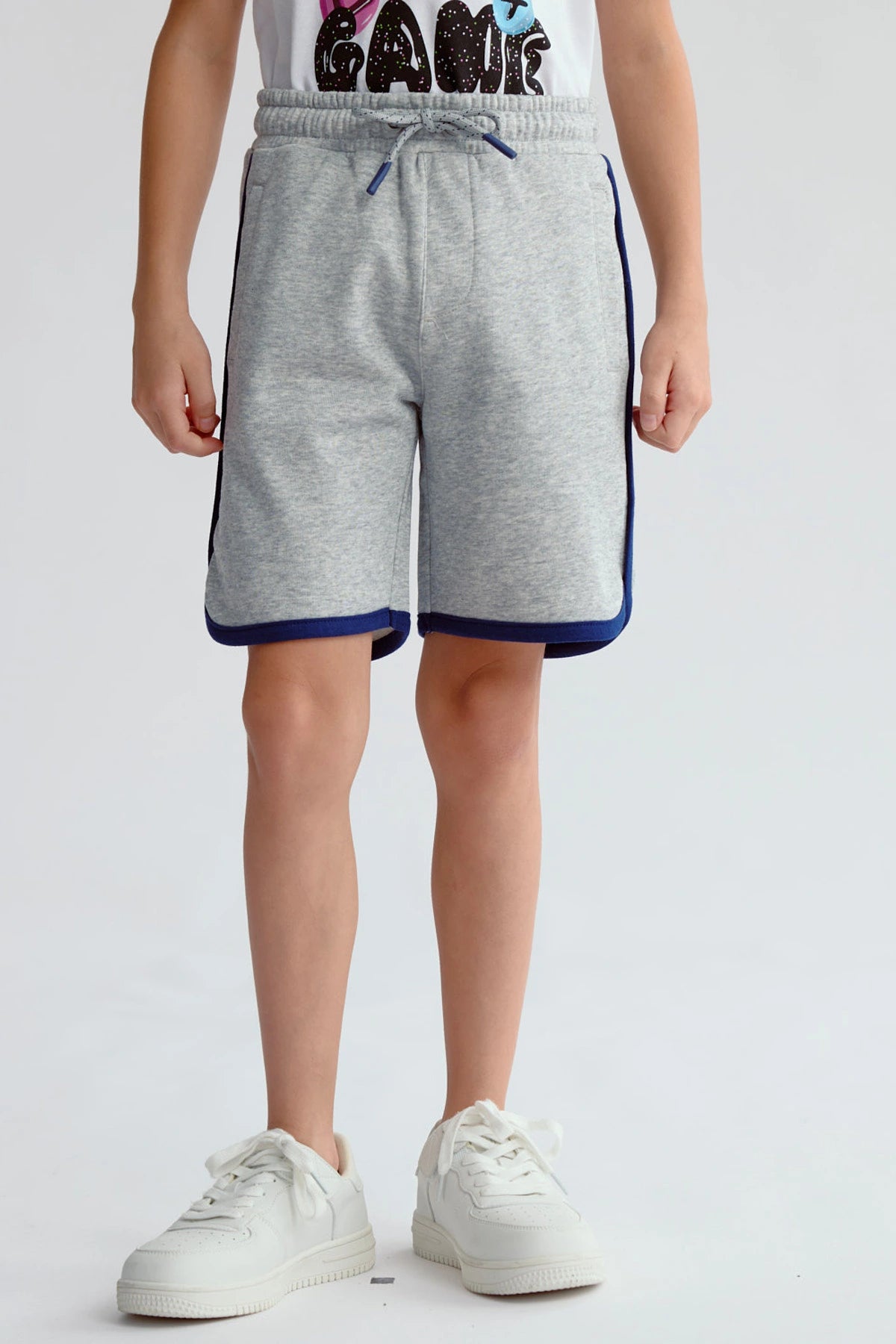 Bermuda gris melange para niño con cordón azul y detalles oscuros en los bordes