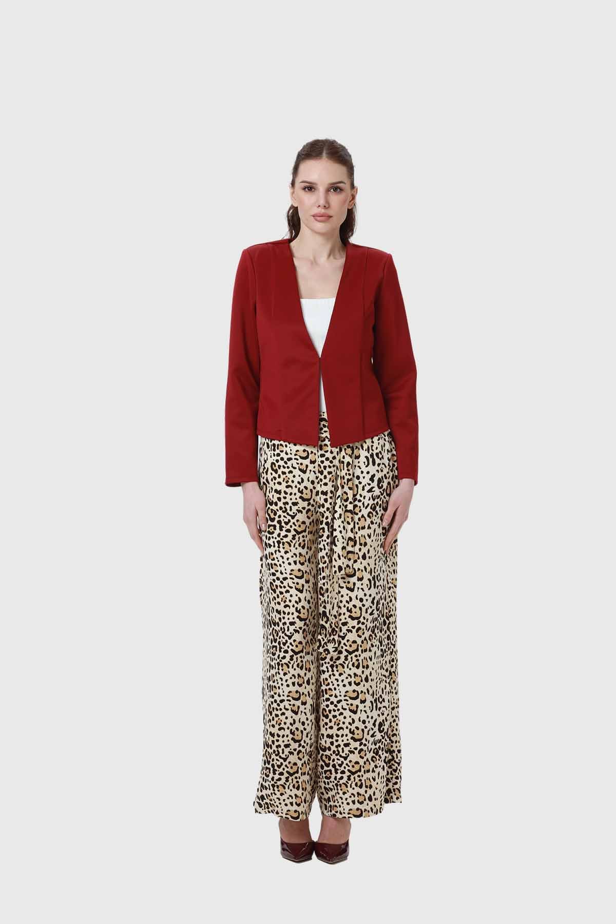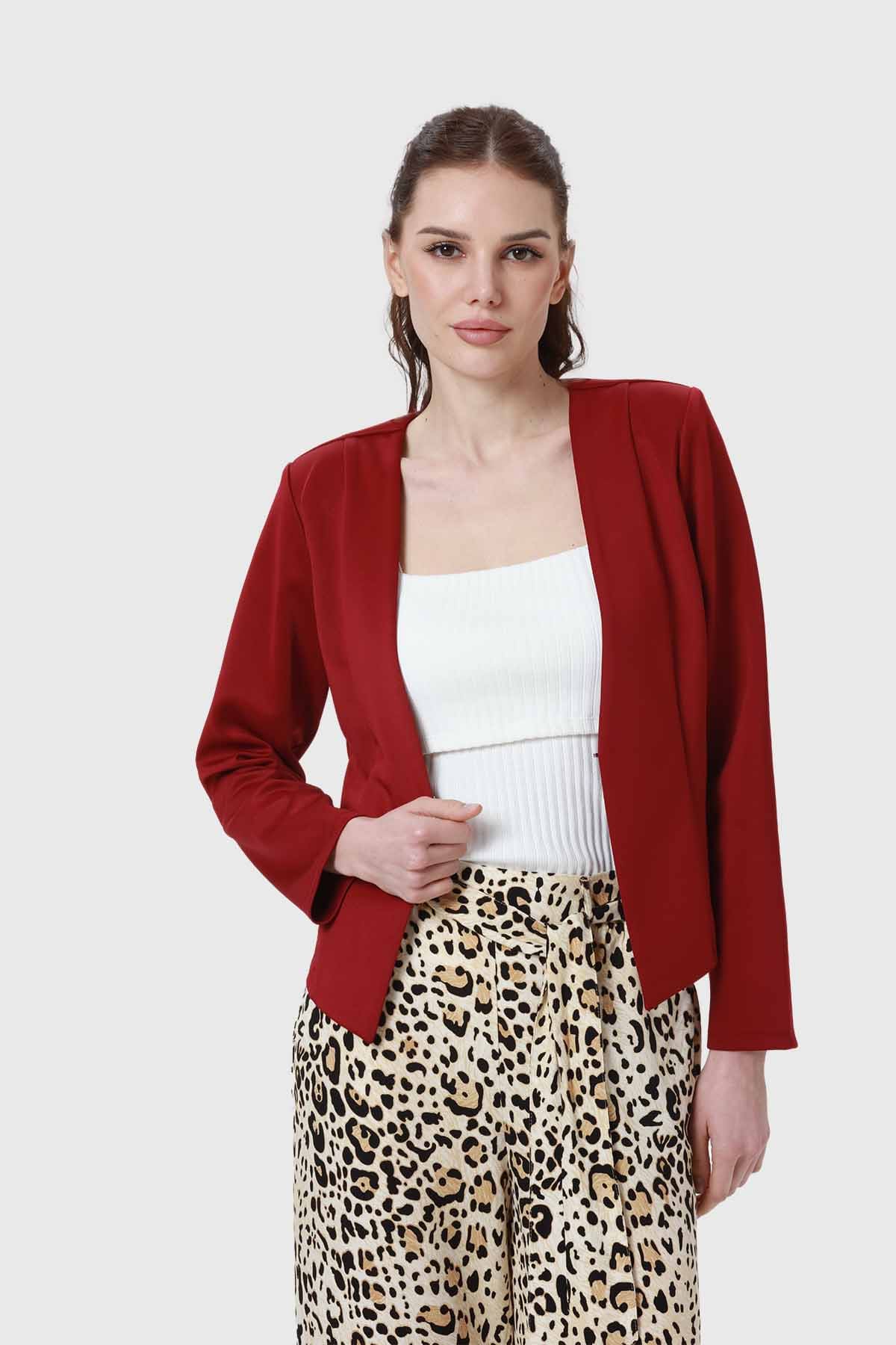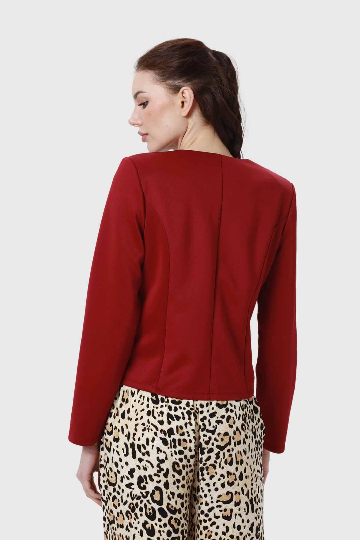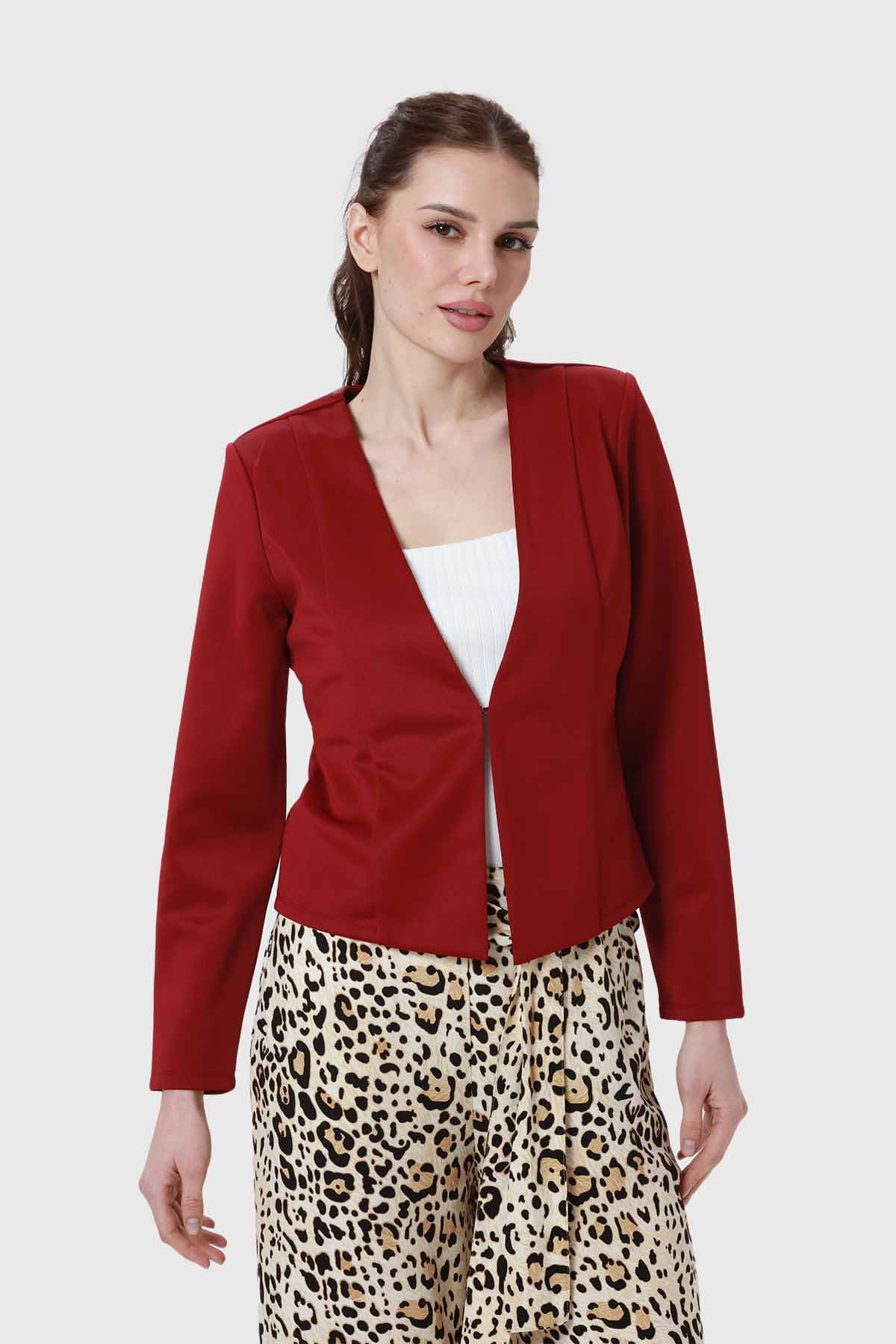 Descubre el blazer liso sin solapa en un elegante color burdeos, ideal para darle un toque sofisticado a tu look. Confeccionado en un material suave que brinda comodidad y abrigo ligero, este blazer es perfecto para cualquier ocasión. Su diseño sin solapa le otorga un estilo moderno y versátil, permitiendo combinarlo fácilmente con diferentes prendas. Ya sea para una reunión de trabajo o una salida casual, este blazer se convertirá en tu aliado favorito. Atrévete a renovar tu estilo y destaca tu personalidad con esta prenda única que realza tu elegancia natural.