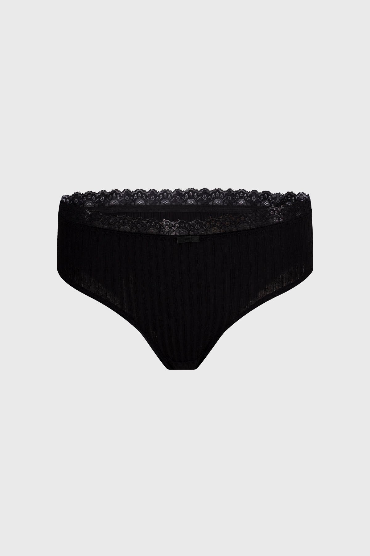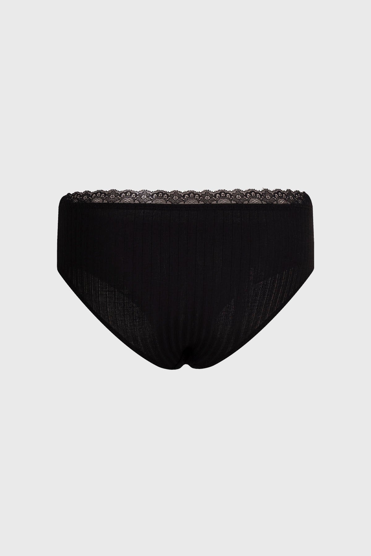 Calzón de mujer lila con encaje en la cintura y textura acanalada Calzón mujer negro con ribete de encaje en la cintura