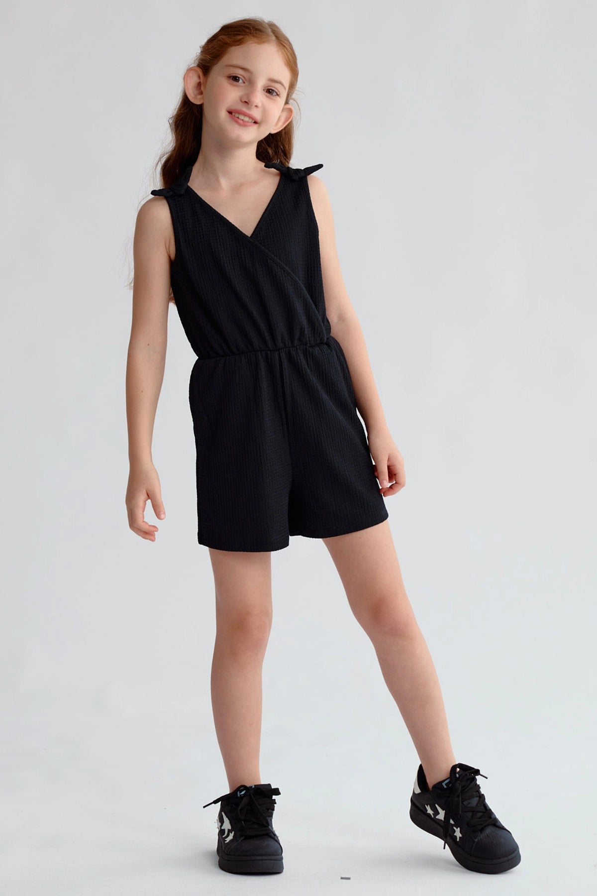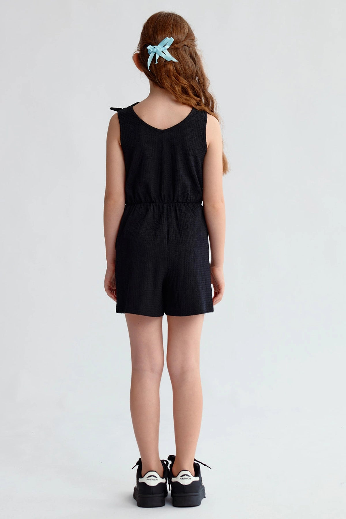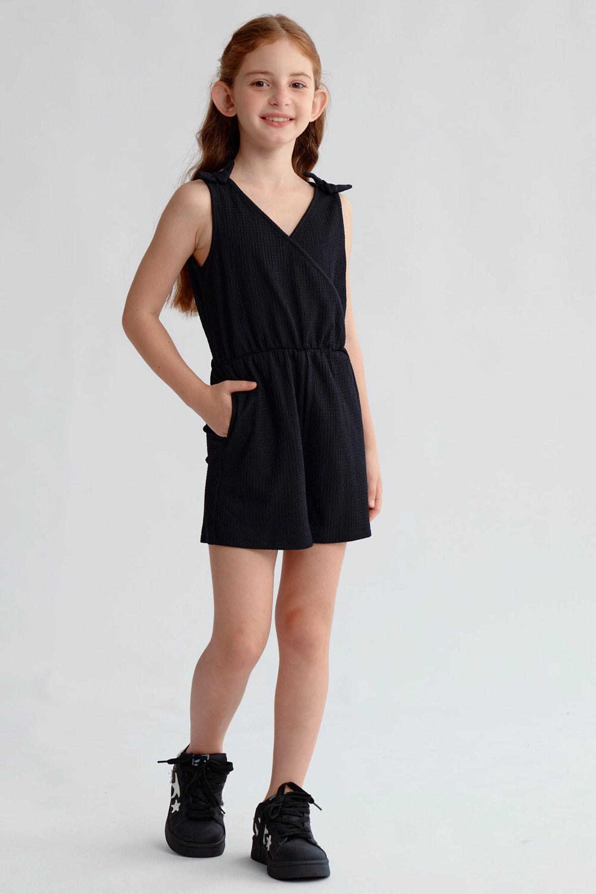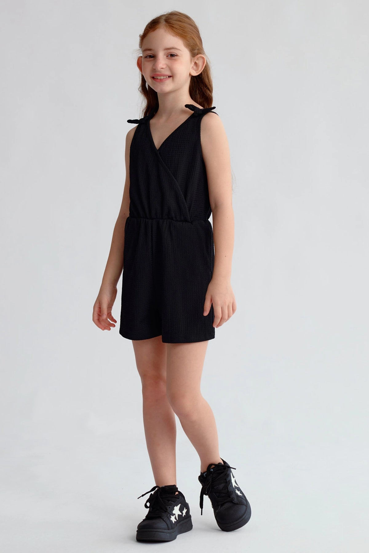 Este enterito negro para niña destaca por su diseño liso con nudos en los hombros, brindando un look sencillo y elegante. Su corte cómodo permite libertad de movimiento, ideal para un día activo. Perfecto para combinar con zapatillas coloridas y una chaqueta ligera en tardes de juego al aire libre. Una prenda esencial para el armario de tu pequeña.