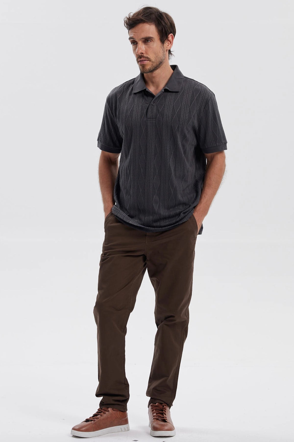 Esta polera gris para hombre presenta un diseño texturizado que destaca por su elegancia y versatilidad. Confeccionada en una mezcla suave y ligera, ofrece un ajuste cómodo y moderno. Ideal para una salida casual o un almuerzo con amigos, se puede combinar con jeans oscuros y zapatillas blancas para un look equilibrado y estiloso.