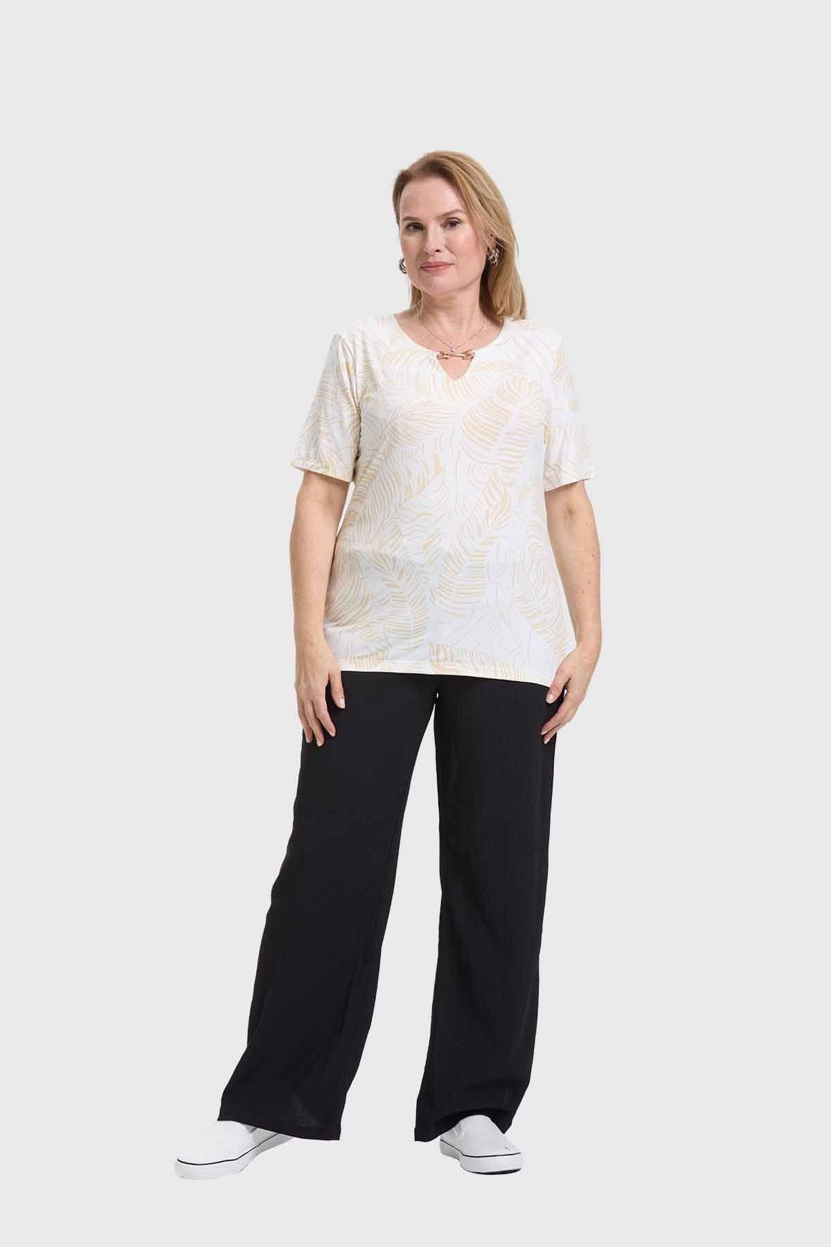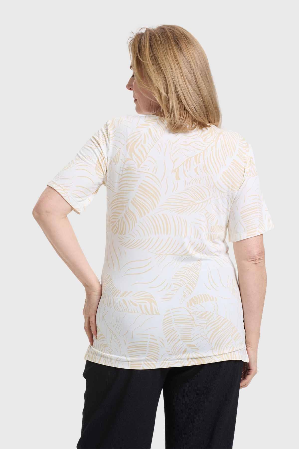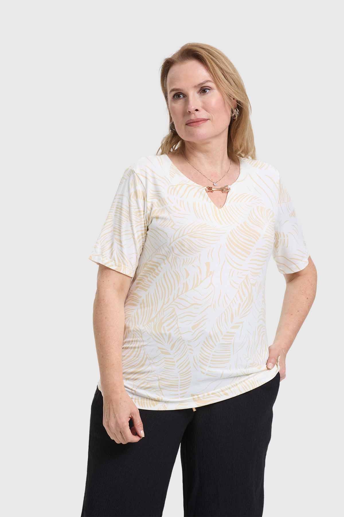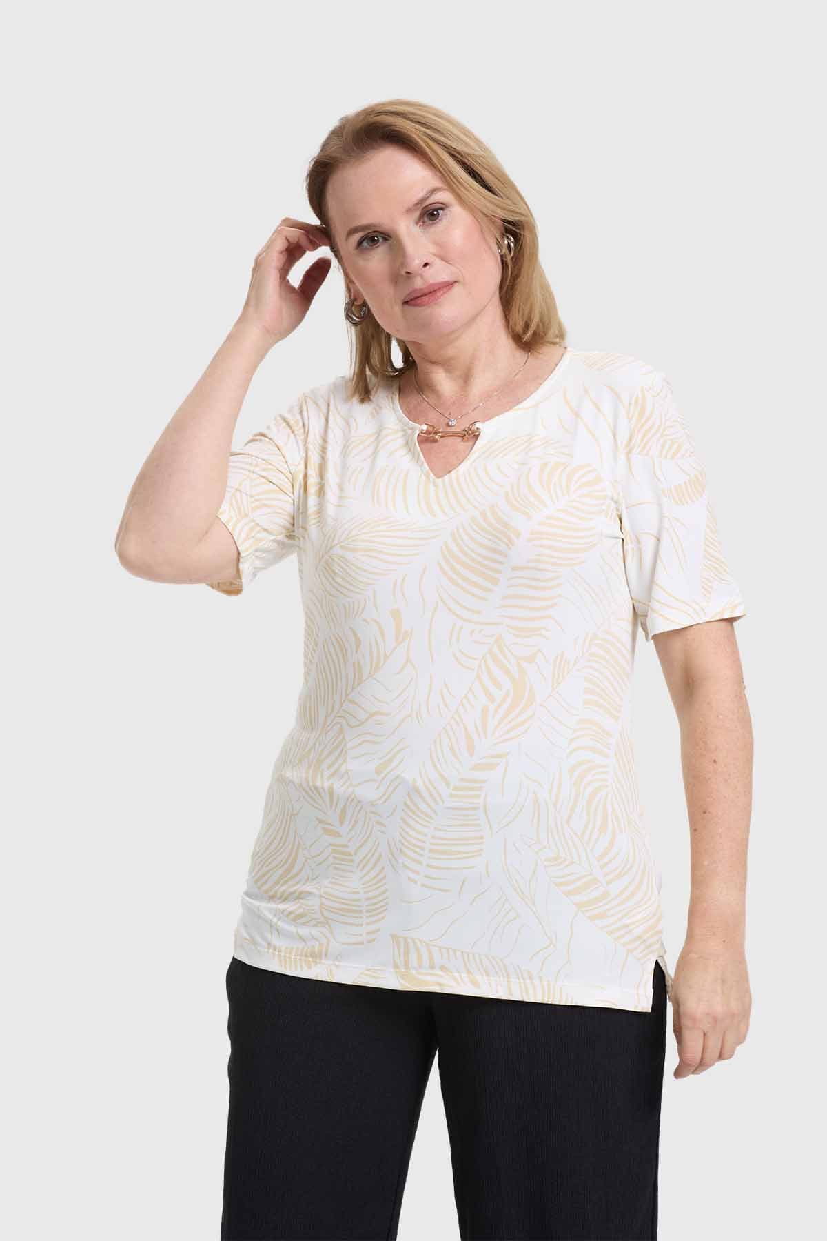 Descubre nuestra polera mujer en un suave color beige, confeccionada en algodón que brinda una comodidad excepcional. Su diseño con estampado de hojas le da un toque fresco y moderno, ideal para cualquier ocasión. La suavidad del material te hará sentir ligera y cómoda durante todo el día. Perfecta para combinar con jeans o faldas, esta polera es una opción versátil que realza tu estilo personal. Atrévete a lucir única y auténtica con esta prenda que refleja tu esencia.