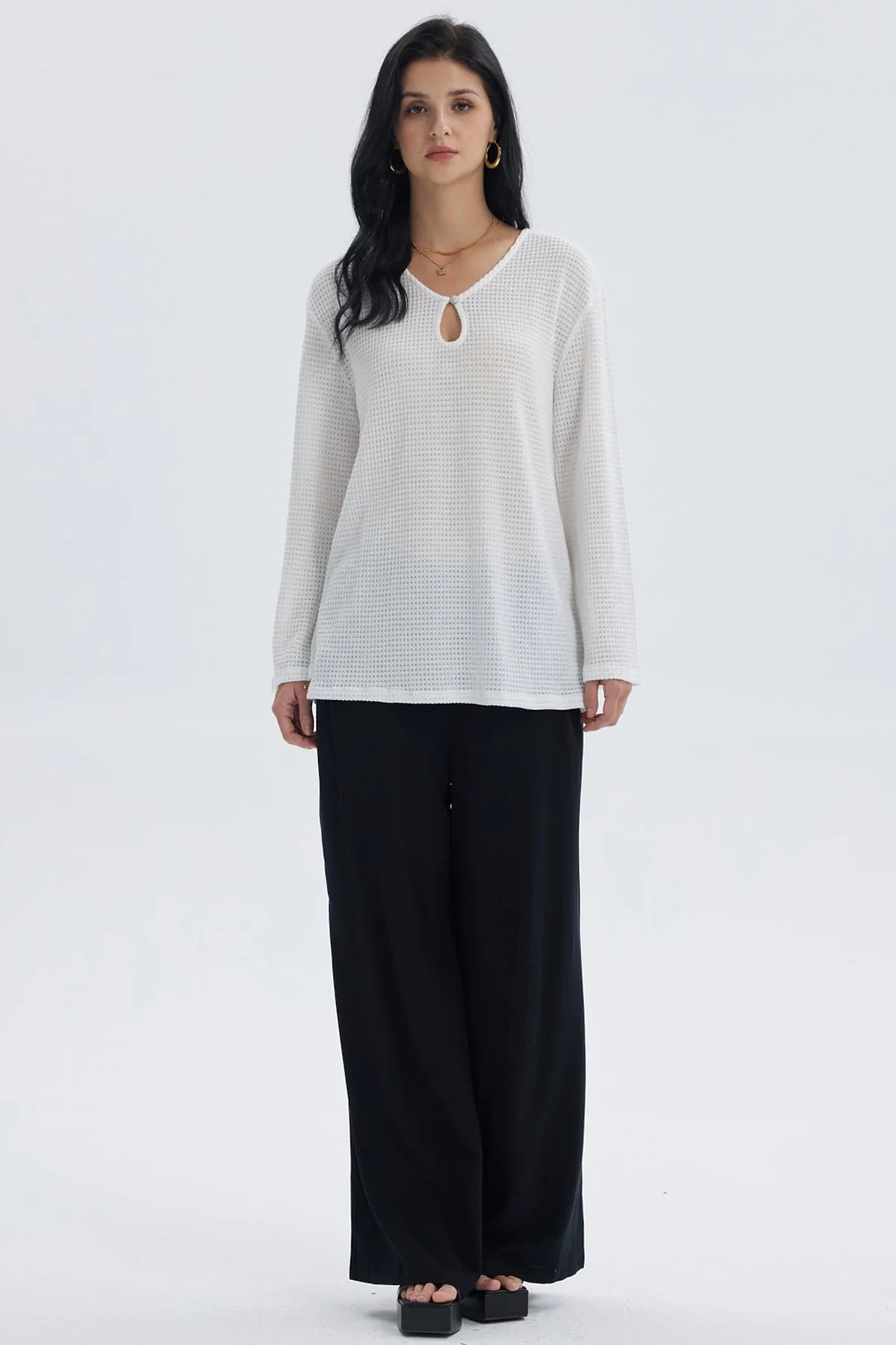 Polera blanca calada de mujer con diseño de salida de baño y mangas largas