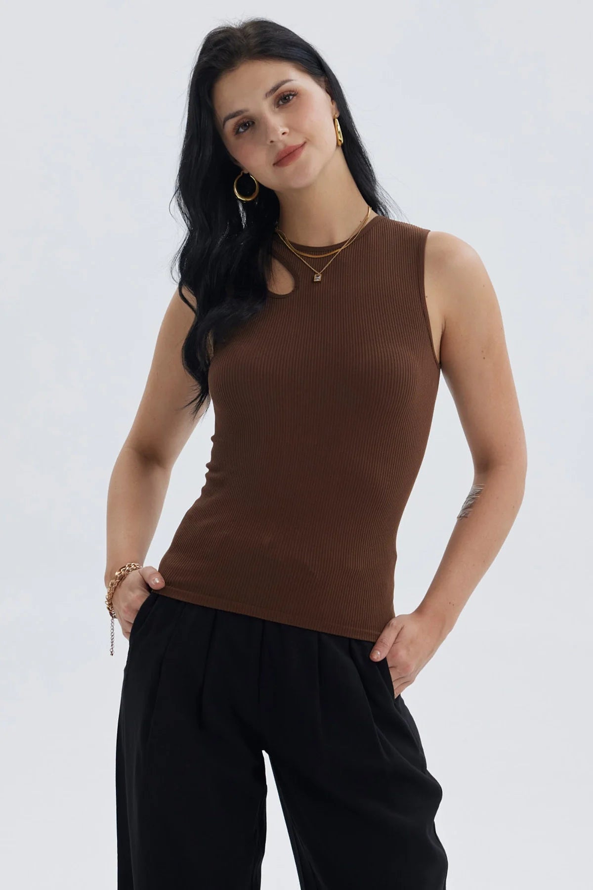 Esta polera sin mangas para mujer en color café ofrece un diseño liso y elegante, ideal para un look casual con estilo. Su tejido ajustado proporciona una sensación cómoda y flexible gracias al spandex, adaptándose perfectamente a la silueta. El cuello redondo y las costuras finas aseguran un acabado pulcro. Perfecta para una salida al cine o una tarde de café, esta prenda combina genial con unos jeans claros y zapatillas blancas, creando un conjunto fresco y moderno. Añade un collar dorado para un toque extra de sofisticación.