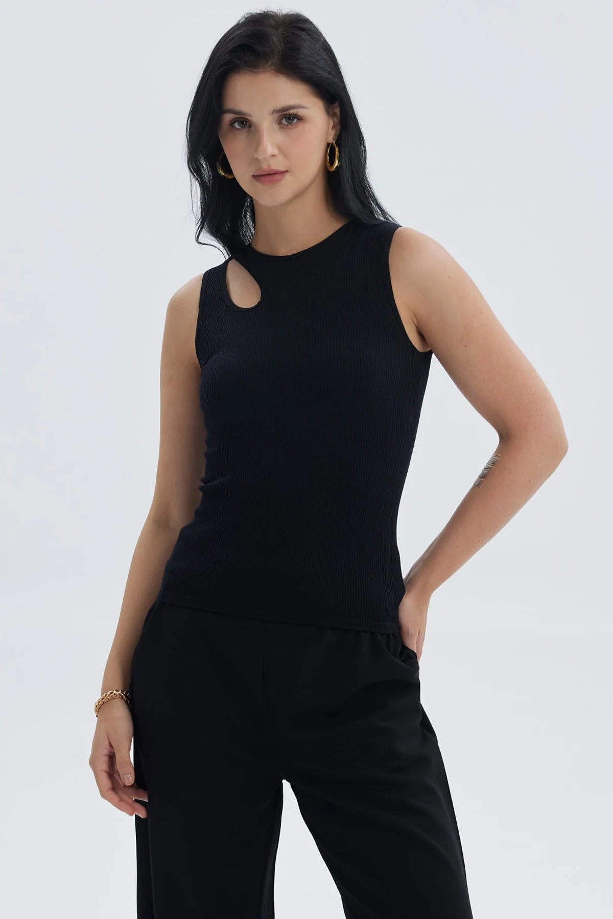 Esta polera negra para mujer presenta un diseño liso y moderno con una abertura en el hombro que añade un toque distintivo. Su textura suave y elástica, gracias al spandex, ofrece comodidad y un ajuste perfecto al cuerpo. Ideal para una salida casual con amigas, combina perfectamente con unos jeans claros y zapatillas blancas, creando un look relajado y estiloso. También puedes usarla con una falda midi y botines para un estilo más sofisticado.