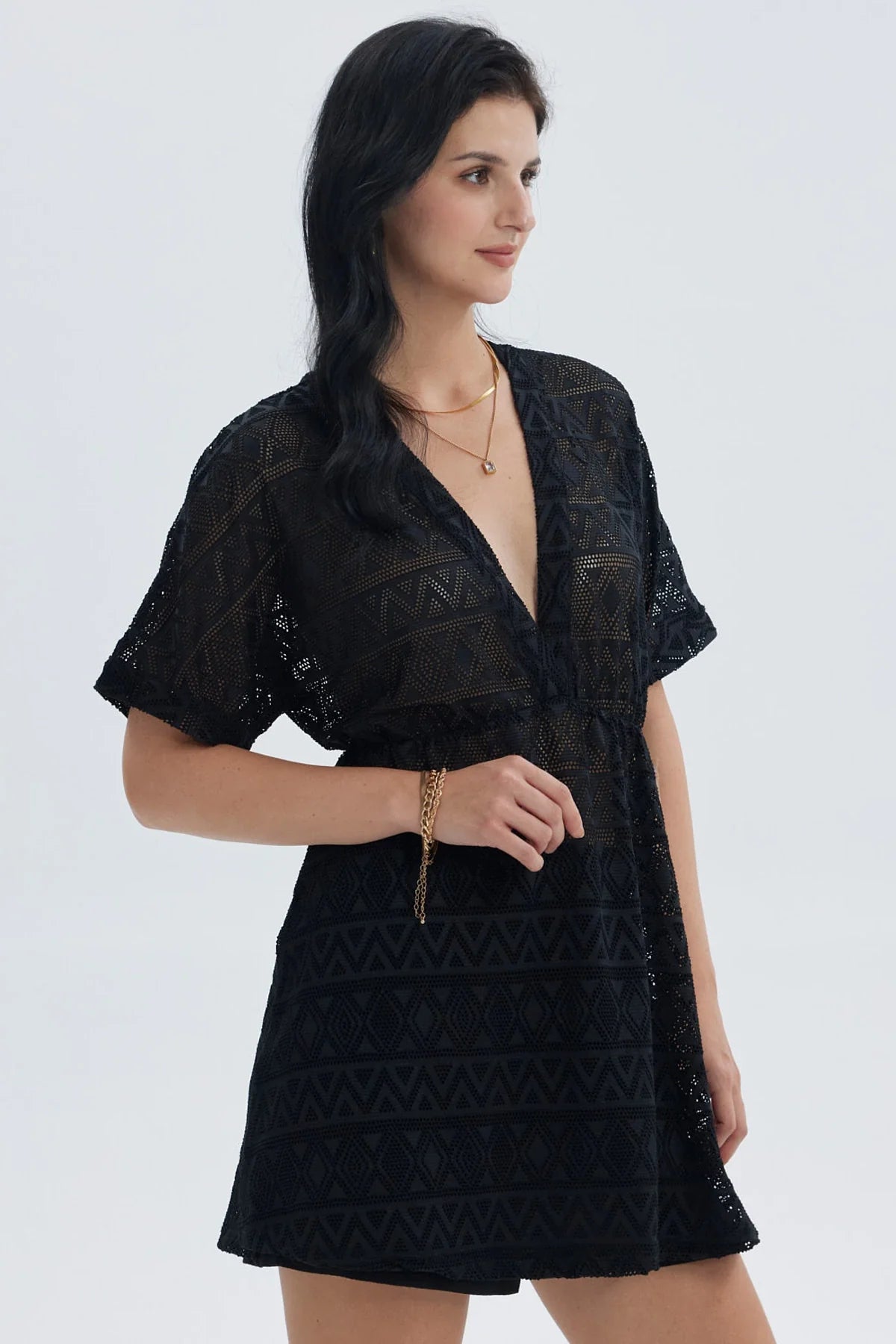 Esta polera negra para mujer es una prenda ideal para lucir fresca y estilosa en la playa o la piscina. Su diseño liso con un tejido ligero y transparente le da un toque sofisticado y veraniego. El corte holgado y las mangas cortas aseguran comodidad y libertad de movimiento, mientras que el escote en V resalta el cuello de manera elegante. Combina esta polera con un bikini llamativo y unas sandalias playeras para disfrutar de un día de sol. También puedes llevarla sobre un vestido ajustado para una salida casual con amigos.