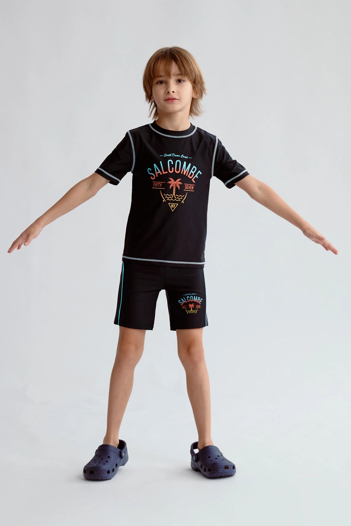 Este short de baño para niño en color negro presenta un diseño liso con detalles en la cintura y laterales que aportan un toque moderno. La textura suave y elástica asegura comodidad durante todo el día. Ideal para días de piscina, su estilo sencillo se complementa fácilmente con una polera blanca y sandalias veraniegas. Perfecto para un día de juegos acuáticos o una tarde en la playa.