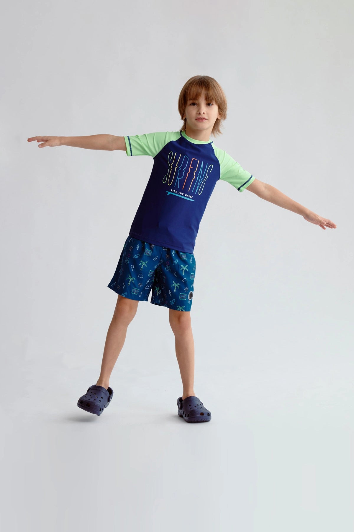 Este short de baño para niño, en un vibrante color verde petróleo, destaca por su diseño estampado de palmeras y radios que evoca un ambiente playero. La textura ligera y suave garantiza comodidad durante largas jornadas de diversión en la piscina o la playa. Su ajuste elástico en la cintura proporciona un calce seguro y fácil de usar. Ideal para un día soleado en la playa, se combina a la perfección con una polera blanca y sandalias cómodas, creando un look fresco y veraniego para cualquier pequeño aventurero.