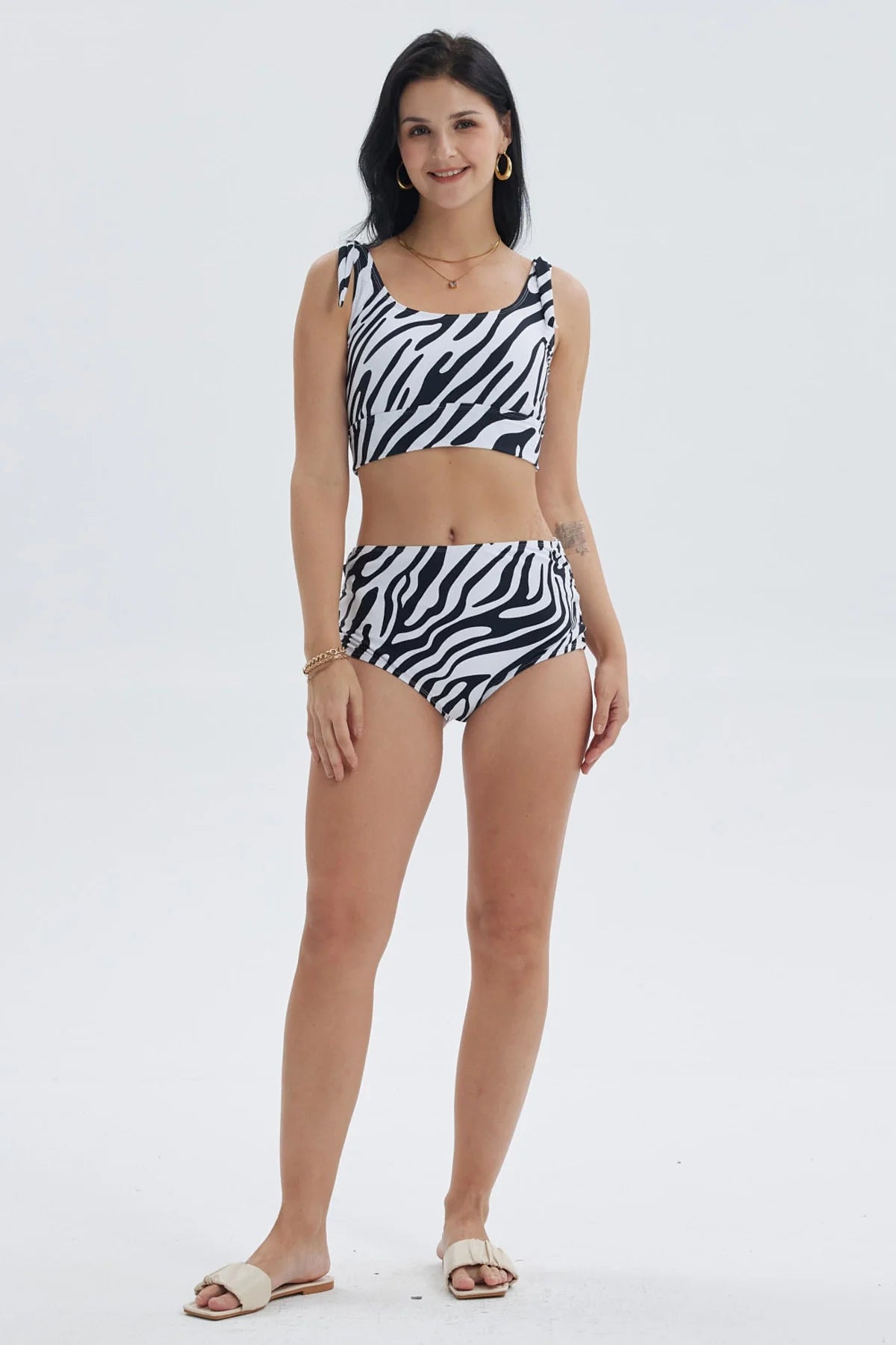 Este traje de baño de mujer en color blanco destaca por su elegante estampado tipo zebra que aporta un toque atrevido y moderno. Diseñado con un tiro alto, ofrece un ajuste cómodo y favorecedor que estiliza la figura. Su confección sin botones ni cierres asegura una sensación de libertad y confort. Ideal para disfrutar de un día de playa o piscina, combina a la perfección con un sombrero de ala ancha y unas sandalias ligeras, creando un look veraniego y chic.