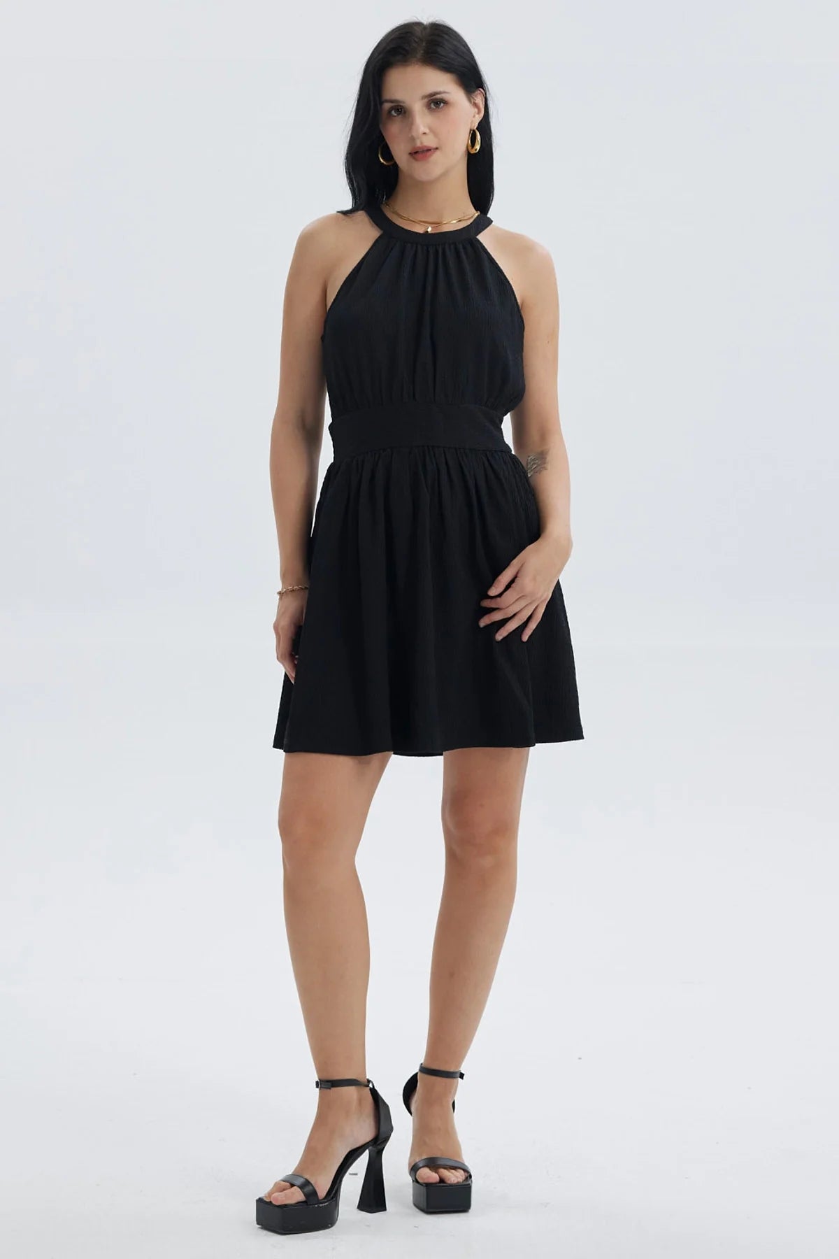 Este vestido corto negro para mujer destaca por su diseño liso y corte elegante. Con una textura suave y un ajuste cómodo gracias al toque de spandex, es ideal para una cena romántica o una salida nocturna. Su estilo sin mangas permite libertad de movimiento y lo hace perfecto para combinar con sandalias altas y una chaqueta ligera en las noches más frescas. Agrega unos accesorios dorados para un look sofisticado y completo.