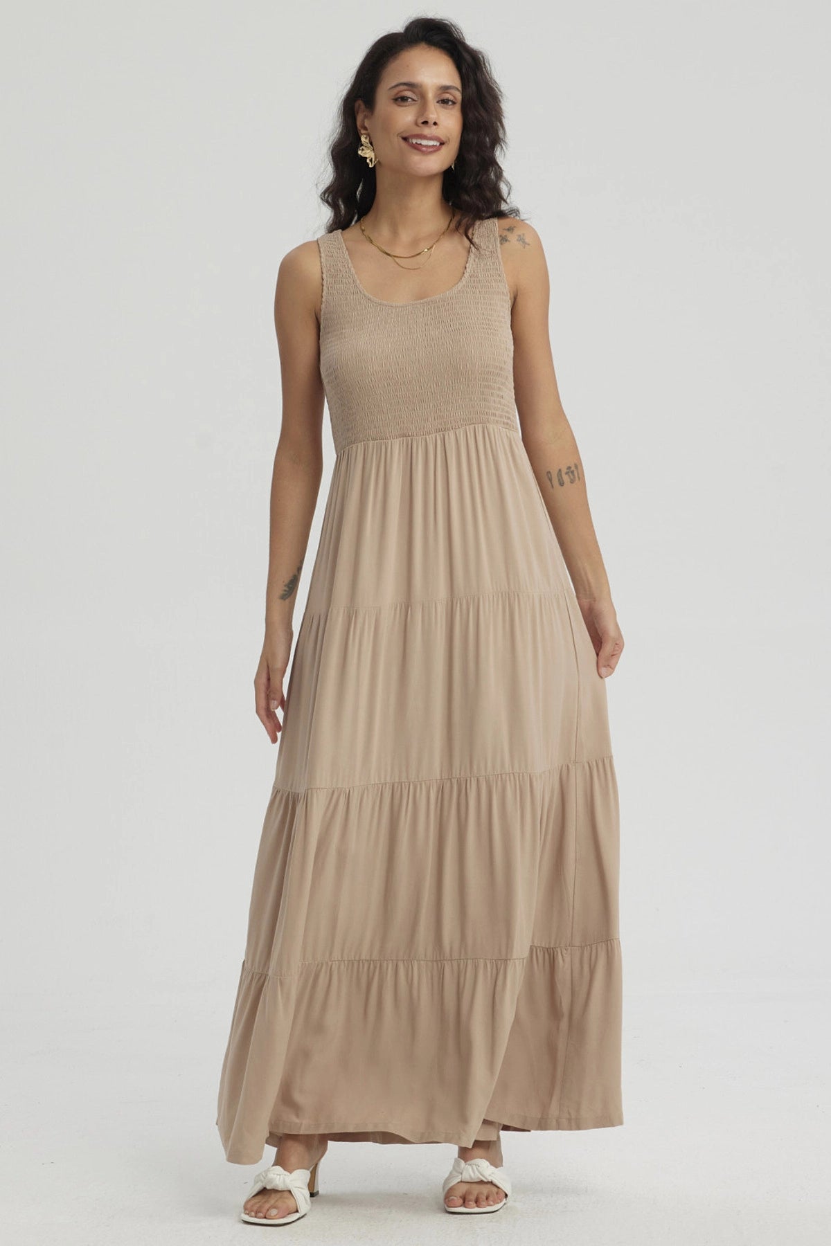 Inicio/Black Friday/Vestido Mujer Largo En Capas Aplicación Panal Beige